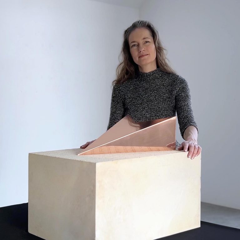 Marie Louise Kold med verket Legacy, skapat i koppar och maltesisk kalksten. Foto:Pressbild